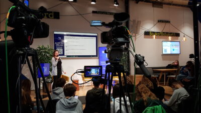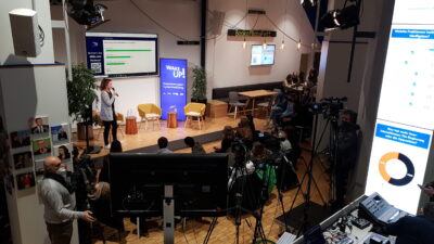 Wir haben bei dieser Produktion 5 Kameras eingesetzt. Neben der Zuspielung von Grafiken, Videos und Slido haben wir eine vom Programm unabhängige Beschaltung des großen Displays auf der Bühne durgeführt. Ein Schaltgast wurde via Vmix-Call in die Sendung eingebunden und über einen 40″ Monitor auf der Bühne präsentiert.