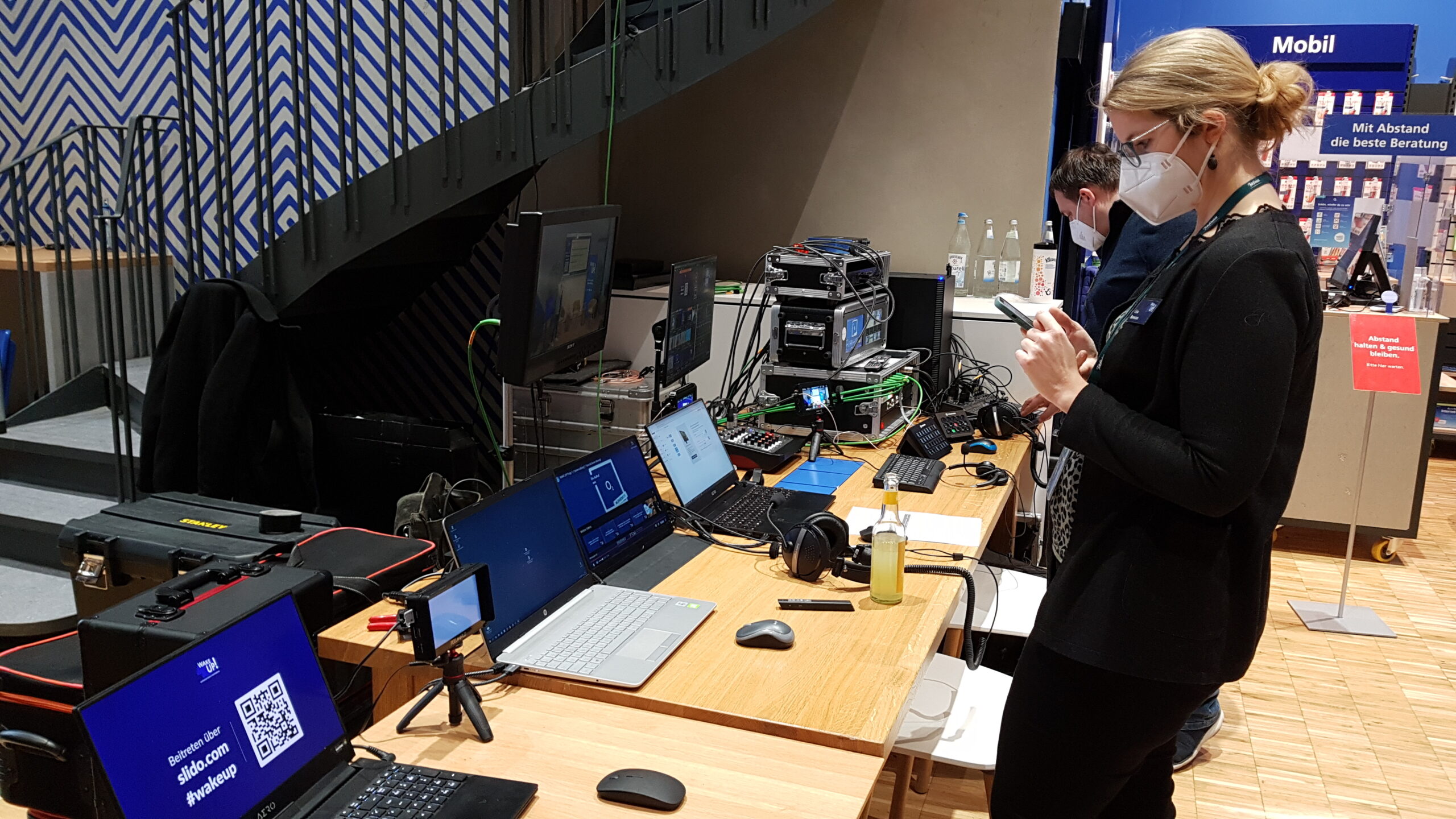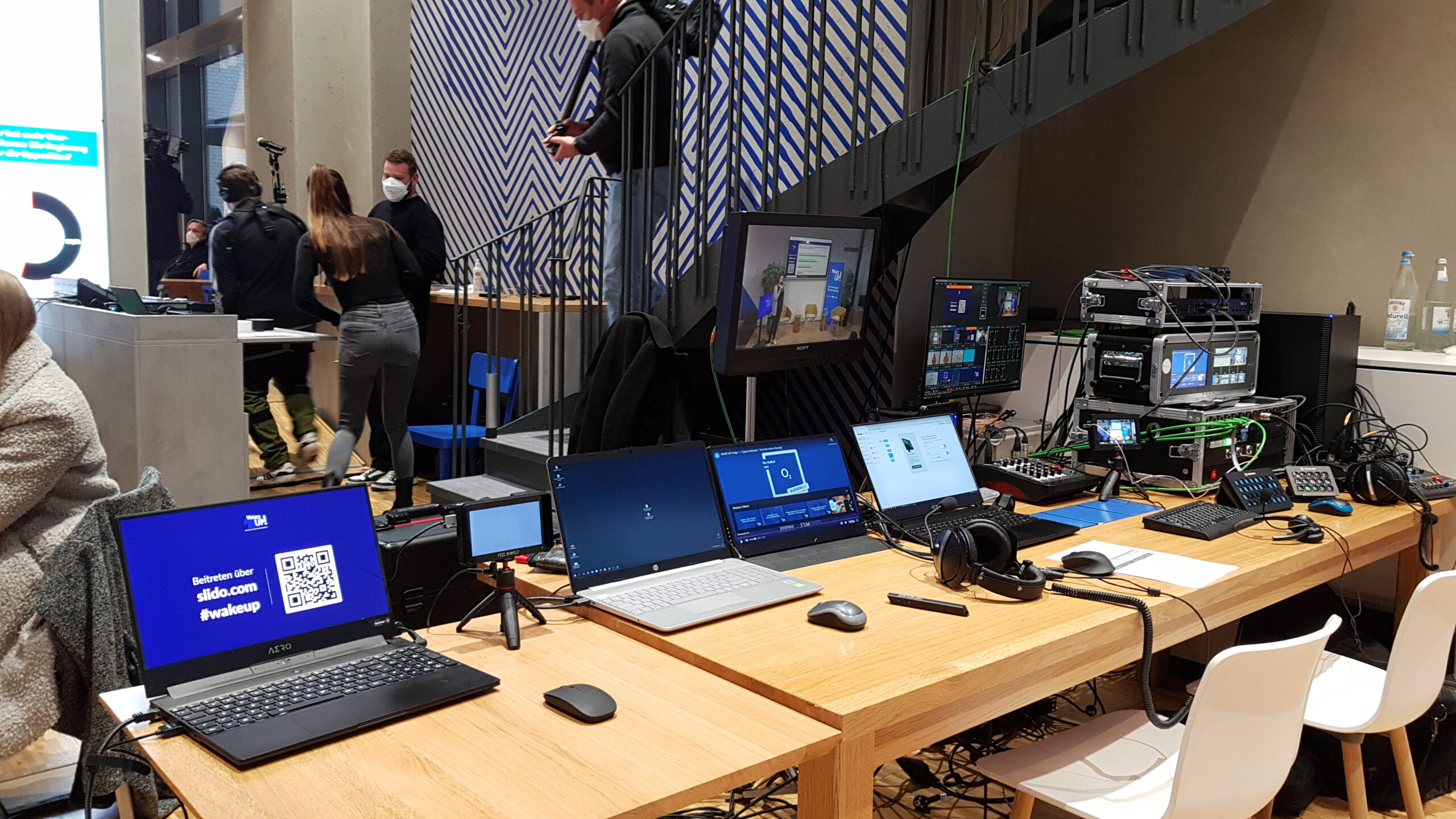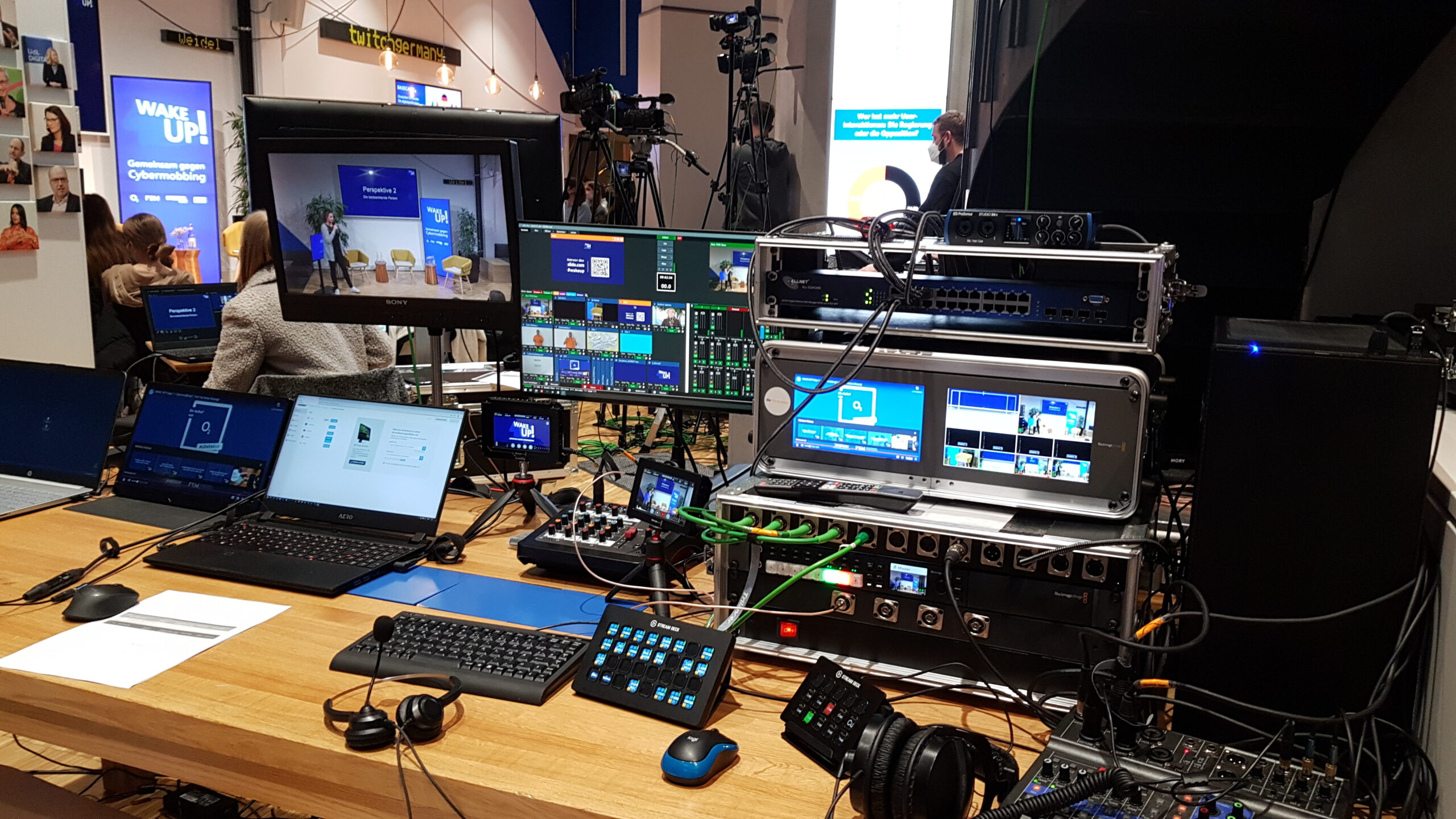 Wir haben bei dieser Produktion 5 Kameras eingesetzt. Neben der Zuspielung von Grafiken, Videos und Slido haben wir eine vom Programm unabhängige Beschaltung des großen Displays auf der Bühne durgeführt. Ein Schaltgast wurde via Vmix-Call in die Sendung eingebunden und über einen 40″ Monitor auf der Bühne präsentiert.